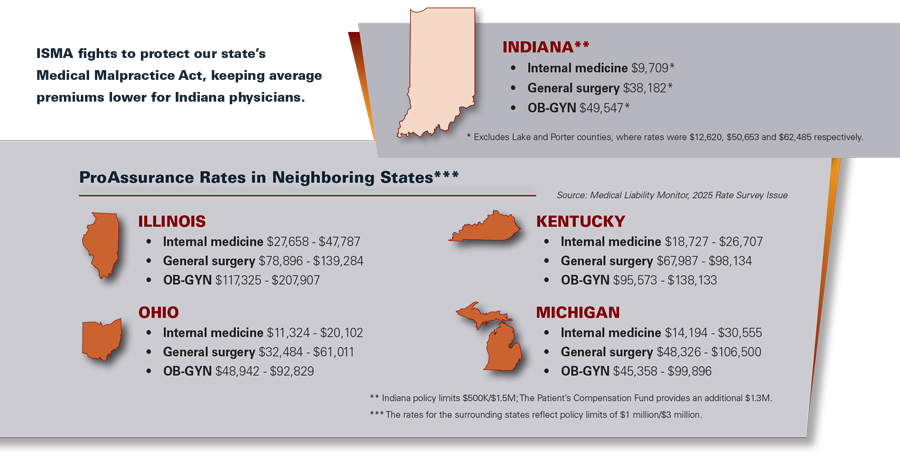 According to ISMA’s most recent membership and advocacy overview, Indiana’s malpractice insurance rates are now 40% to 70% lower than in surrounding states, a gap the association links to the durability of the Medical Malpractice Act and the state’s tort-reform structure.