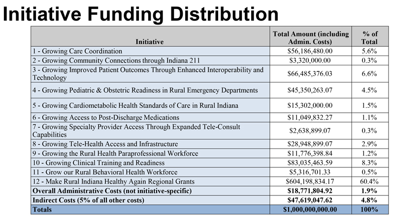 The 12 initiatives in the Indiana Rural Health Transformation grant application are shown with the amount of grant dollars tied to the initiative as well as the proportion of funding overall.