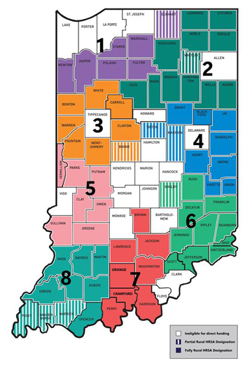 The Indiana Rural Health Association (IRHA), Indiana Hospital Association (IHA) and Indiana Primary Health Care Association (IPHCA) are providing technical assistance to regions as the coalitions determine their needs, design initiatives and prepare their applications. For more information about the RFF or Regional Committees and a map of the eight regions, visit