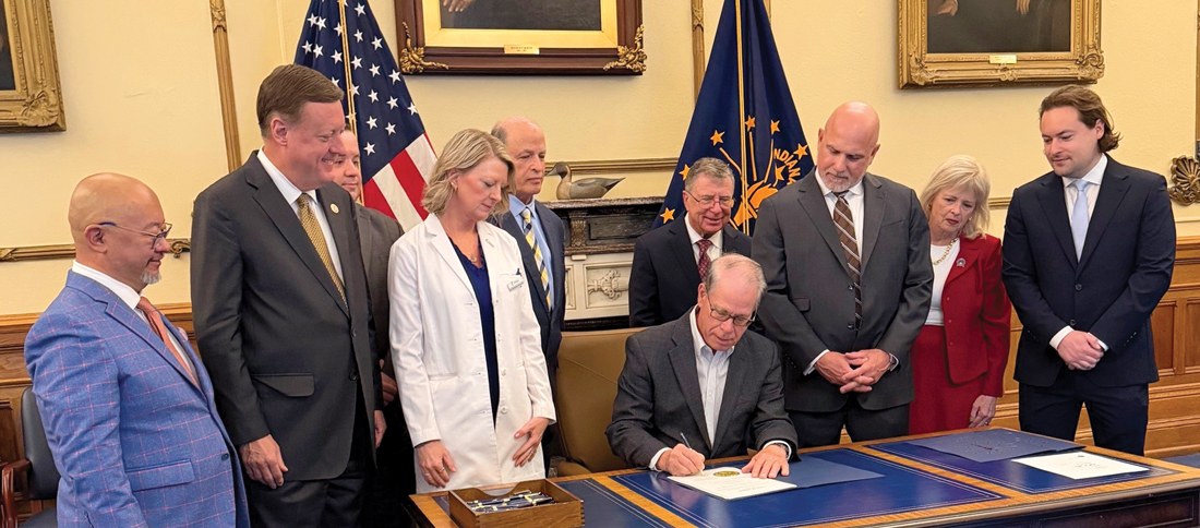 Governor Mike Braun ceremoniously signed SB 189/Public Law 119 into law on Tuesday. The legislation prohibits a health carrier from assessing a facility or provider an administrative fee or penalty related to the provision of care to an individual involving an out-of-network provider. Indiana is the first in the nation to have this legislation.