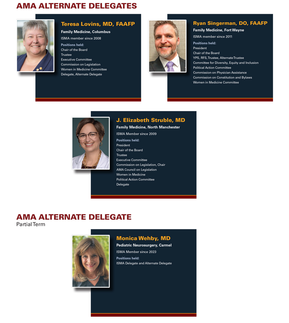 Dr. Hatcher’s election as delegate opened a fourth alternate delegate seat; Monica Wehby, MD, Carmel, was elected to serve the 15 months remaining in Dr. Hatcher’s term.